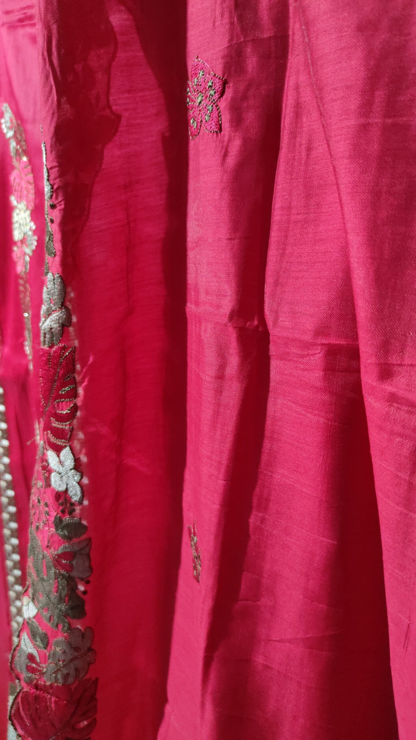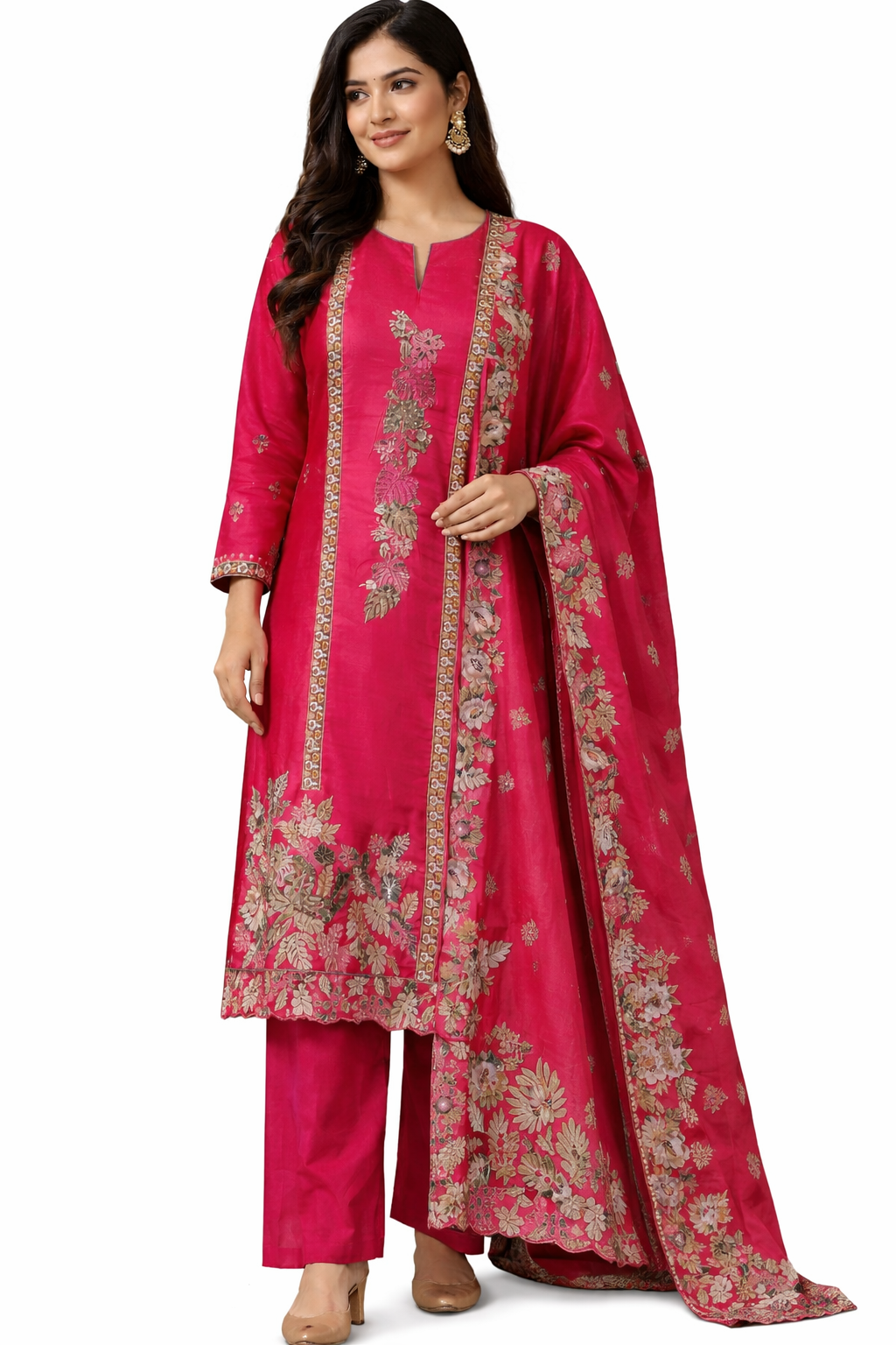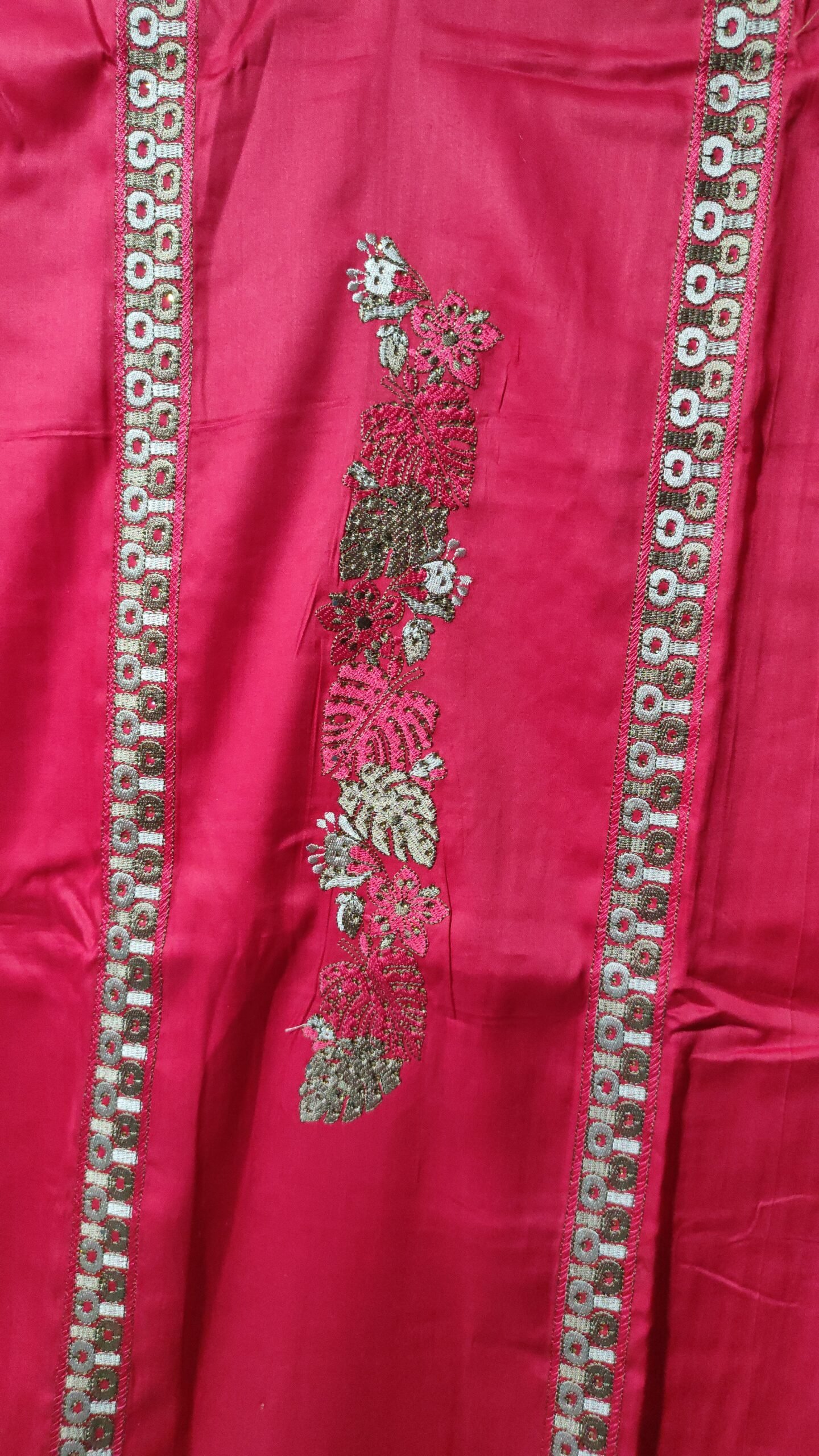 Designed in a rich and vibrant red shade, this suit reflects grace, celebration, and traditional charm. The front panel is beautifully enhanced with embroidered vertical borders and a detailed floral center motif, giving it a structured and premium look.